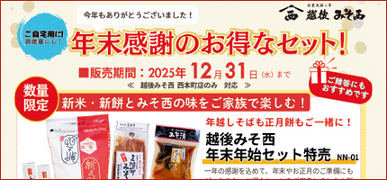 【2025年冬のギフトカタログ特集はこちら!】 越後みそ西のみそ、みそ漬の他、新潟の美味しいものをぎゅっと詰めてお届けします! |
